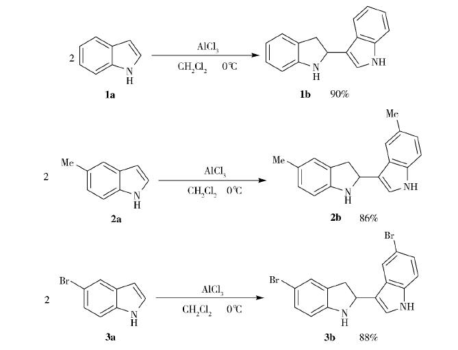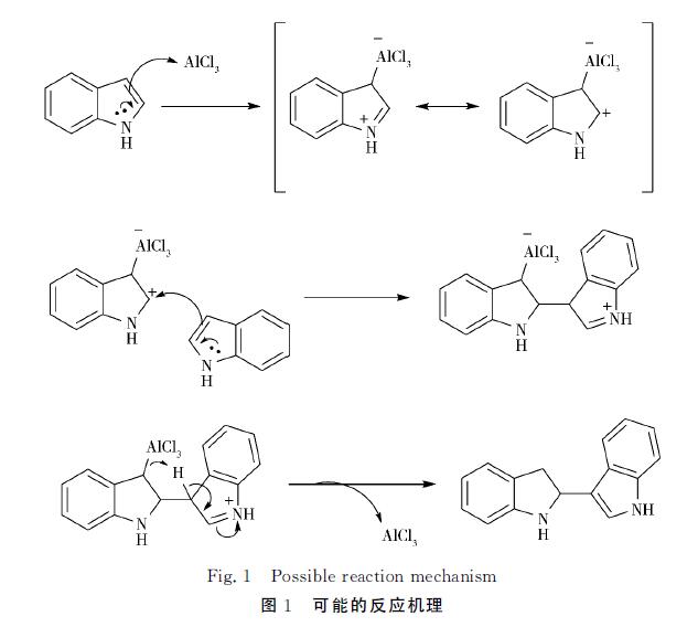 2.2 反應(yīng)機(jī)理討論 筆者結(jié)合相關(guān)文獻(xiàn)及實(shí)驗(yàn)結(jié)果,提出了可能的反應(yīng)機(jī)理:首先三氯化鋁活化吲哚的C-3位,生成亞胺 離子中間體,使吲哚的C-2位顯正電性;接下來(lái)另一分子吲哚C-3位的碳原子進(jìn)攻這個(gè)正電中心[17], 實(shí)現(xiàn)偶聯(lián);偶聯(lián)中間體發(fā)生質(zhì)子轉(zhuǎn)移[并失去三氯化鋁形成最終產(chǎn)物,離去的三氯化鋁繼續(xù)催化反應(yīng) (圖1)。